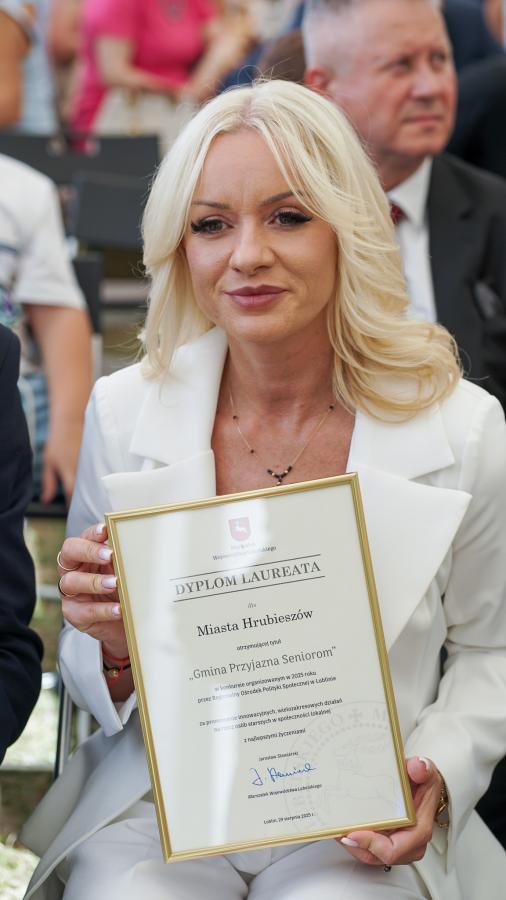 Z dumą informujemy, że Hrubieszów został Laureatem prestiżowego konkursu „Gmina Przyjazna Seniorom”, organizowanego przez Regionalny Ośrodek Polityki Społecznej w Lublinie. Uroczyste wręczenie nagród odbyło się 29 sierpnia 2025 r. podczas „Integracyjnego Wojewódzkiego Dnia Rodzin”, zorganizowanego przez Marszałka Województwa Lubelskiego oraz ROPS w Lublinie. Nagrodę w imieniu Burmistrz Miasta Hrubieszowa Marty Majewskiej odebrała Kierownik Miejskiego Ośrodka Pomocy Społecznej w Hrubieszowie – Aldona Malińska-Margol. To wyjątkowe wyróżnienie jest dowodem na to, że seniorzy stanowią serce Hrubieszowa – aktywnie uczestniczą w życiu społecznym, rozwijają swoje pasje i każdego dnia udowadniają, że można cieszyć się pełnią życia niezależnie od wieku.