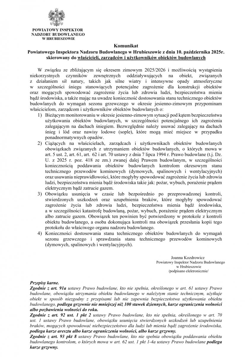Komunikat Powiatowego Inspektora Nadzoru Budowlanego w Hrubieszowie z dnia 10. października 2025r. skierowany do właścicieli, zarządców i użytkowników obiektów budowlanych W związku ze zbliżającym się okresem zimowym 2025/2026 i możliwością wystąpienia niekorzystnych czynników zewnętrznych oddziaływujących na obiekt, związanych z działaniem sił natury, takich jak silne wiatry i intensywne opady atmosferyczne w szczególności śniegu stanowiących potencjalne zagrożenie dla konstrukcji obiektów oraz mogących spowodować zagrożenie życia lub zdrowia ludzi, bezpieczeństwa mienia bądź środowiska, a także mając na uwadze konieczność dostosowania stanu technicznego obiektów budowlanych do wymagań sezonu grzewczego w okresie jesienno-zimowym przypominam właścicielom, zarządcom i użytkowników obiektów budowlanych o: 1) Bieżącym monitorowaniu w okresie jesienno-zimowym sytuacji pod kątem bezpieczeństwa użytkowania obiektów budowlanych, w szczególności potencjalnego ich zagrożenia zalegającym na dachach śniegiem. Bezwzględnie należy usuwać zalegający na dachach śnieg i lód oraz nawisy lodowe (sople), które mogą mieć miejsce w przypadku ponadnormatywnych opadów. 2) Ciążących na właścicielach, zarządcach i użytkownikach obiektów budowlanych obowiązkach związanych z utrzymaniem obiektów budowlanych, o których mowa w art. 5 ust. 2, art. 61, art. 62 i art. 70 ustawy z dnia 7 lipca 1994 r. Prawo budowlane (t.j. Dz. U. z 2025 r. poz. 418 ze zm.) zwanej dalej Prawem budowlanym, w szczególności koniecznością poddawania obiektów budowlanych kontrolom okresowym stanu technicznego przewodów kominowych (dymowych, spalinowych i wentylacyjnych) oraz usuwania nieprawidłowości, które mogłyby spowodować zagrożenie życia lub zdrowia ludzi, bezpieczeństwa mienia bądź środowiska takie jak: pożar, wybuch, porażenie prądem elektrycznym bądź zatrucie gazem. 3) Obowiązku usunięcia w czasie lub bezpośrednio po przeprowadzonej kontroli, stwierdzonych uszkodzeń oraz uzupełnienia braków, które mogłyby spowodować zagrożenie życia lub zdrowia ludzi, bezpieczeństwa mienia bądź środowiska, a w szczególności katastrofę budowlaną, pożar, wybuch, porażenie prądem elektrycznym albo zatrucie gazem. Obowiązek ten powinien być potwierdzony w protokole z kontroli obiektu budowlanego, a osoba dokonująca kontroli ma obowiązek przesłania kopii tego protokołu do właściwego organu nadzoru budowlanego. 4) Konieczności dostosowania stanu technicznego obiektów budowlanych do wymagań sezonu grzewczego i sprawdzania stanu technicznego przewodów kominowych (dymowych, spalinowych i wentylacyjnych). Joanna Kozdrowicz Powiatowy Inspektor Nadzoru Budowlanego w Hrubieszowie /podpisano elektronicznie/ Przepisy karne. Zgodnie z art. 91a ustawy Prawo budowlane, kto nie spełnia, określonego w art. 61 ustawy Prawo budowlane, obowiązku utrzymania obiektu budowlanego w należytym stanie technicznym, użytkuje obiekt w sposób niezgodny z przepisami lub nie zapewnia bezpieczeństwa użytkowania obiektu budowlanego, podlega grzywnie nie mniejszej niż 100 stawek dziennych, karze ograniczenia wolności albo pozbawienia wolności do roku. Zgodnie z art. 92 ust. 1 pkt 2 ustawy Prawo budowlane, kto nie spełnia, określonego w art. 70 ust. 1 ustawy Prawo budowlane, obowiązku usunięcia stwierdzonych uszkodzeń lub uzupełnienia braków, mogących spowodować niebezpieczeństwo dla ludzi lub mienia bądź zagrożenie środowiska, podlega karze aresztu albo karze ograniczenia wolności, albo karze grzywny. Zgodnie z art. 93 pkt 8 ustawy Prawo budowlane, kto nie spełnia obowiązku poddawania obiektu budowlanego kontrolom, o których mowa w art. 62 ust. 1 pkt 1-4a ustawy Prawo budowlane podlega karze grzywny.
