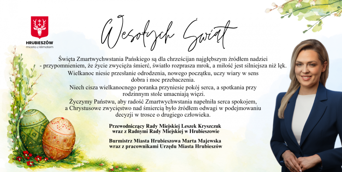 Święta Zmartwychwstania Pańskiego są dla chrześcijan najgłębszym źródłem nadziei - przypomnieniem, że życie zwycięża śmierć, światło rozprasza mrok, a miłość jest silniejsza niż lęk.  Wielkanoc niesie przesłanie odrodzenia, nowego początku, uczy wiary w sens dobra i moc przebaczenia.  Niech cisza wielkanocnego poranka przyniesie pokój serca, a spotkania przy rodzinnym stole umacniają więzi. Życzymy Państwu, aby radość Zmartwychwstania napełniła serca spokojem,a Chrystusowe zwycięstwo nad śmiercią było źródłem odwagi w podejmowaniu decyzji w trosce o drugiego człowieka.
